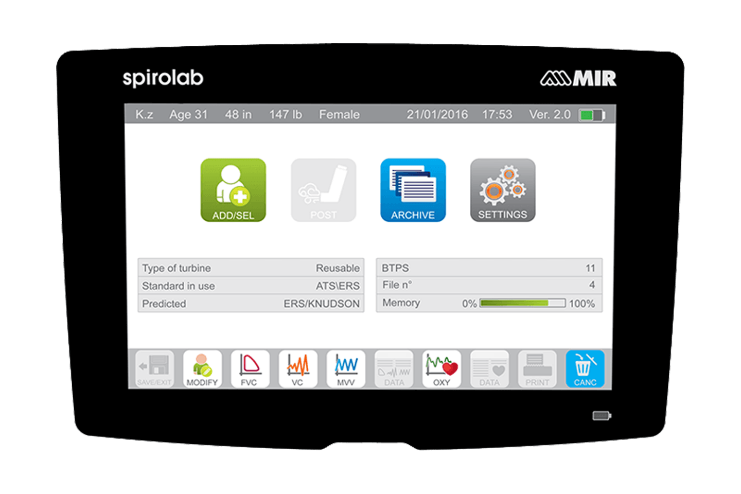 - 7-inch Touchscreen, all-in-one Spirometer with embedded printer and Oximetry option.