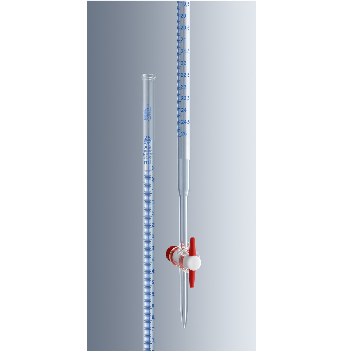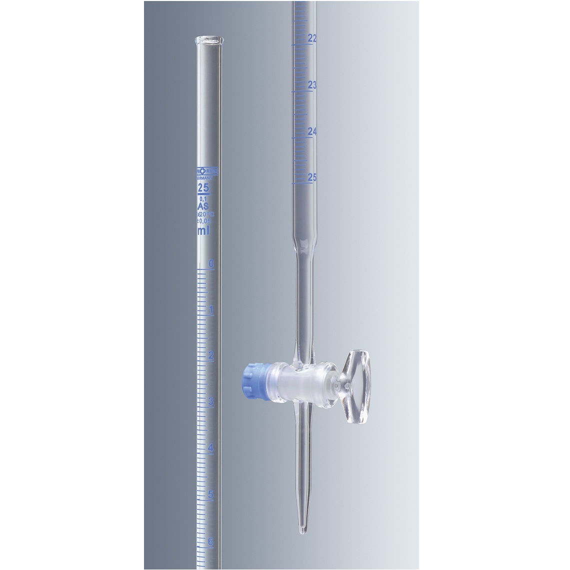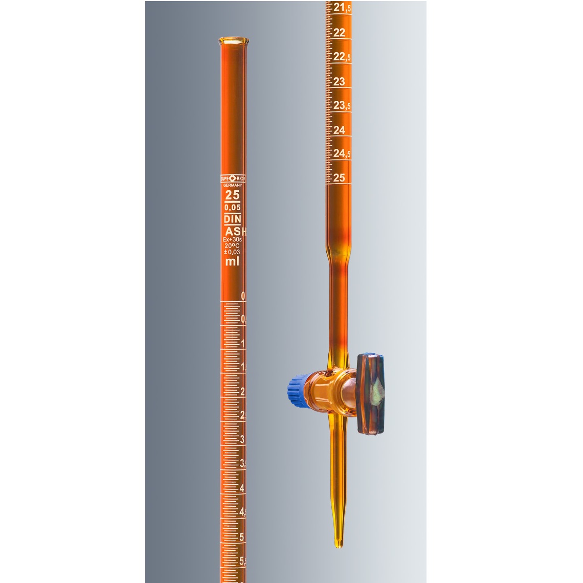 Burettes are calibrated volumetric instruments with graduations and groundin stopcocks. They are used in laboratories for quantitative measurements of smaller liquid volumes in titration. Burettes are calibrated ”Ex” (to deliver): The imprinted volume corresponds to the delivered quantity of liquid.