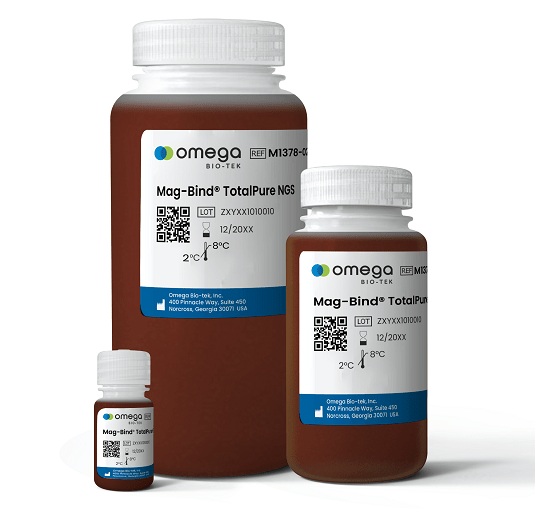 Mag-Bind® TotalPure NGS offers an easy-to-use, reliable solution for the purification of both DNA and RNA for next-generation sequencing workflows with high recovery rates. Mag-Bind® TotalPure NGS is capable of selectively binding fragments depending on the reagent-to-sample ratio used, giving the user flexibility to perform left, right or double-sided size selection. This product is designed for both manual and fully automated purification of DNA and RNA samples, as well as for the purification of PCR products. The system combines Omega Bio-tek’s proprietary chemistries with reversible nucleic acid-binding properties of magnetic beads to selectively bind fragments and eliminate excess nucleotides, primers, and small, non-targeted products such as primer-dimers. Purified DNA and RNA is suitable for a variety of downstream applications such as NGS library preparation, microarrays, automated fluorescent sequencing and restriction enzyme digestion.