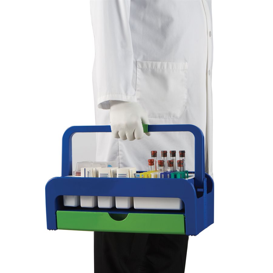 - Tray features a supply drawer, side pockets, and a ratcheting handle with soft rubber grip that rotates out of the way for easy access