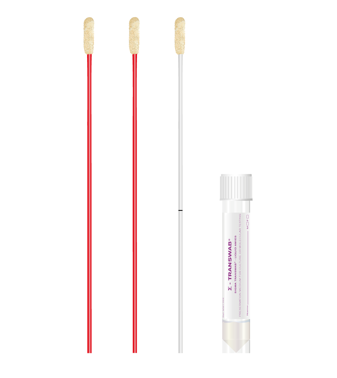 Σ Transwab® with one standard Σ swab and two red shaft Σ swabs. The bud type is cellular foam.